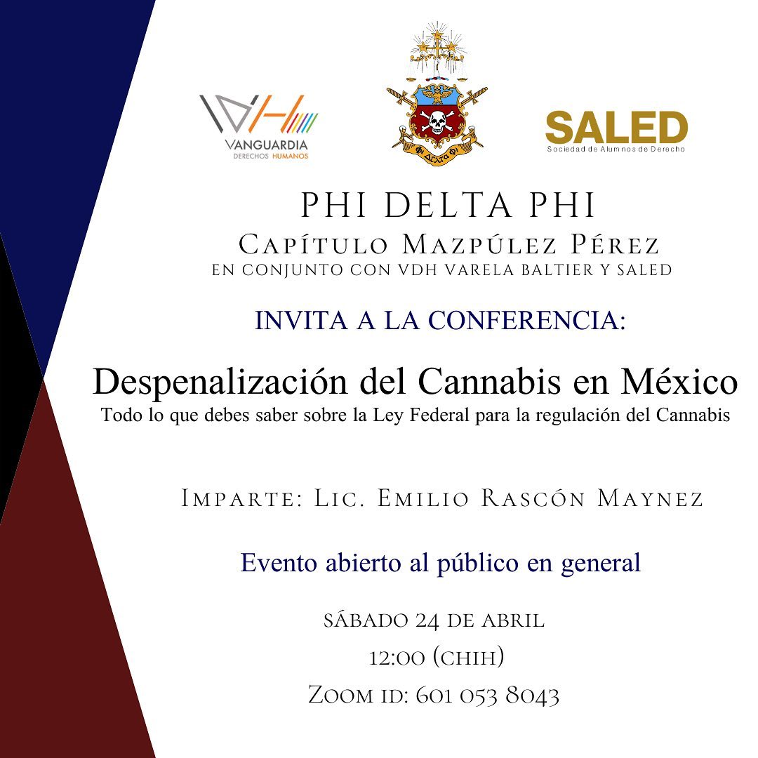 El pasado sábado 24 de abril se llevó a cabo, por parte de Phi Delta Phi Capítulo Mazpúlez Pérez, en conjunto con Vanguardia Derechos Humanos y SALED, la conferencia «Despenalización del Cannabis en México, todo lo que debes saber la Ley Federal para la Regularización del Cannabis» impartida por el Lic. Emilio Rascón Maynez.